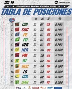 Tabla de posiciones tras la jornada 10, Béisbol Juvenil 2024